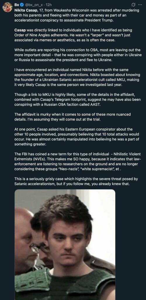 According to WITI, investigators uncovered material on Casap's phone related to "The Order of Nine Angels" -- described by the FBI as a "satanic cult" with "strong anti-Judiac, anti-Christian and anti-Western ideologies" that claims to "incite chaos and violence."