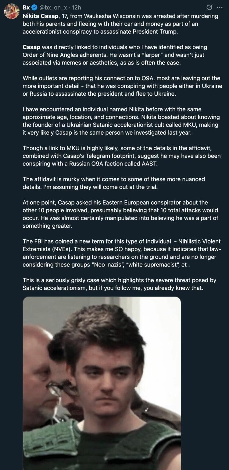 As this post further explains, Casap was also seemingly obsessed with the Satanic Order of Nine Angles: