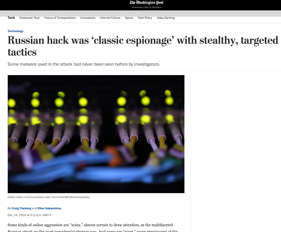 “Scope of Russian Hacking Becomes Clear: Multiple U.S. Agencies Were Hit,” one New York Times headline proclaimed, and the first line of that article, co-written by Sanger, stated definitively: “The scope of a hacking engineered by one of Russia’s premier intelligence agencies became clearer on Monday.” The Washington Post deluged the public with identically certain headlines: