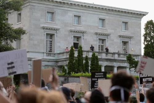 Security personnel stand on the balcony of the home of Mark and Patricia McCloskey as protesters gather outside their neighborhood in St. Louis on July 3, 2020. (Michael B. Thomas/Getty Images)