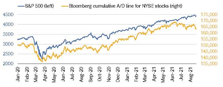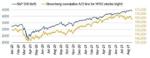 ” As shown in the chart below, although the S&P 500 traded at an all-time high as recently as last week, the cumulative advance/decline (A/D) line for the broader NYSE universe peaked on June 11 this year. The divergence between the two looks similar to early-September last year—the point at which it was mostly the “big 5” stocks within the S&P 500 (the “generals”) that had powered the S&P 500 to its September 2, 2020 high.” – Charles Schwab