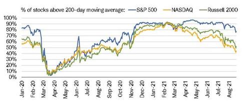 “The percentage of S&P 500 stocks trading above their 50-day moving averages peaked in April, troughed in June, improved until recently, but has come under pressure again. The same can’t be said for the NASDAQ and Russell 2000, which both peaked in early February, since which time they’ve generally been descending.”