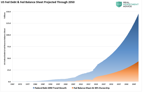 The disappointment of economic growth is also a function of the surging debt and deficit levels, which, as noted above, will have to be entirely funded by the Federal Reserve.
