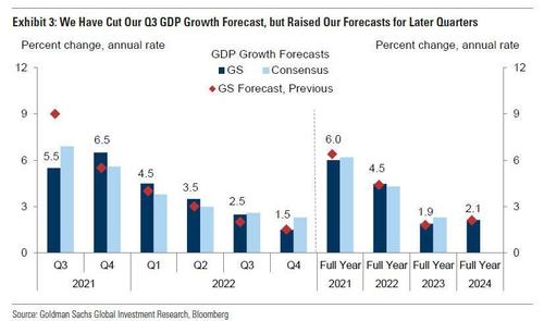 “We have lowered our Q3 GDP forecast to +5.5%, reflecting hits to both consumer spending and production. Spending on dining, travel, and some other services is likely to decline in August, though we expect the drop to be modest and brief. Production is still suffering from supply chain disruptions, especially in the auto industry, and this is likely to mean less inventory rebuild in Q3.” – Goldman Sachs