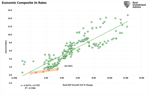 “As shown, the correlation between rates and the economic composite suggests that current expectations of sustained economic expansion and rising inflation are overly optimistic. At current rates, economic growth will likely very quickly rturn to sub-2% growth by 2022.”