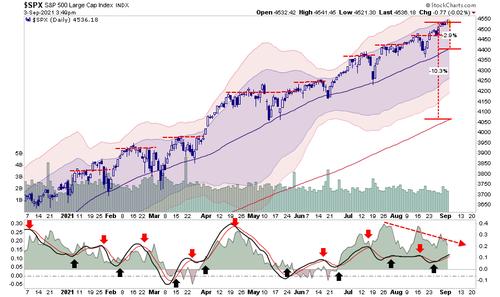 However, in the meantime, the “stairstep” advance continues with fundamentally weak companies making substantial gains as speculation displaces investment in the market. Thus, while prices remain elevated, money flows weaken, suggesting the next downturn is roughly one to two weeks away. So far, those corrections remain limited to the 50-dma, which is approximately 3% lower than Friday’s close, but a 10% correction to the 200-dma remains a possibility.