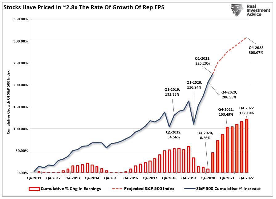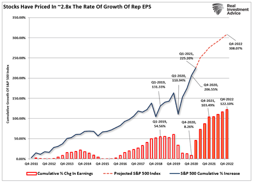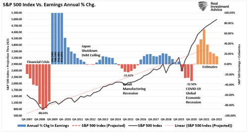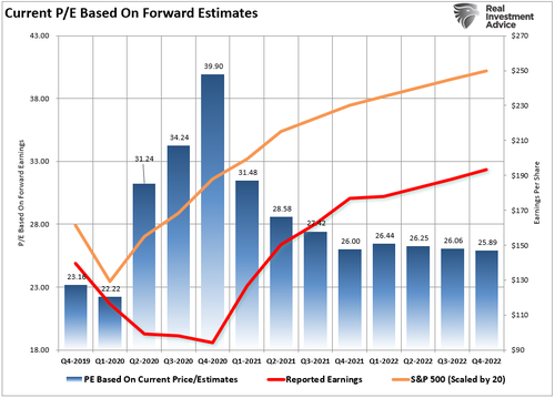 While there seems to be little concern relative to the market’s advance over the last year, maybe that should be the concern given the sharpness of that advance. I will discuss the history of “market melt-ups” and their eventual outcomes in an upcoming article. However, what is essential to notice is the corresponding ramp in valuations as earnings fail to keep up with bullish expectations.