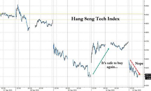 In response to the latest crackdown, the Hang Seng Tech Index - which soared on Friday on speculation that Beijing was finally done destroying its tech conglomerates, plunged as much as 3% in Hong Kong.