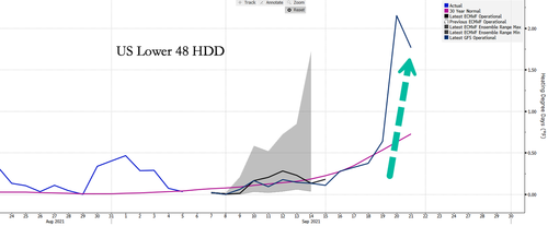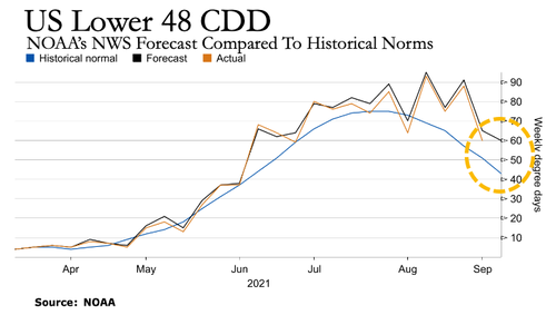 As temperatures are expected to drop later this month, forecasted heating degree days are also rising, showing that colder weather may force some Americans to turn off their air conditioners for the year and turn up the thermostats. This would imply a rise in energy and electricity prices.