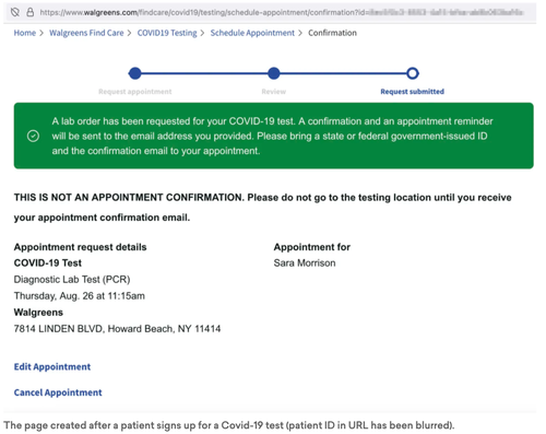 The problems are in Walgreens' Covid-19 test appointment registration system, which anyone who wants to get a test from Walgreens must use (unless they purchase an over-the-counter test). After the patient fills out and submits the form, a unique 32-digit ID number is assigned to them and an appointment request page is created, which has the unique ID in the URL.