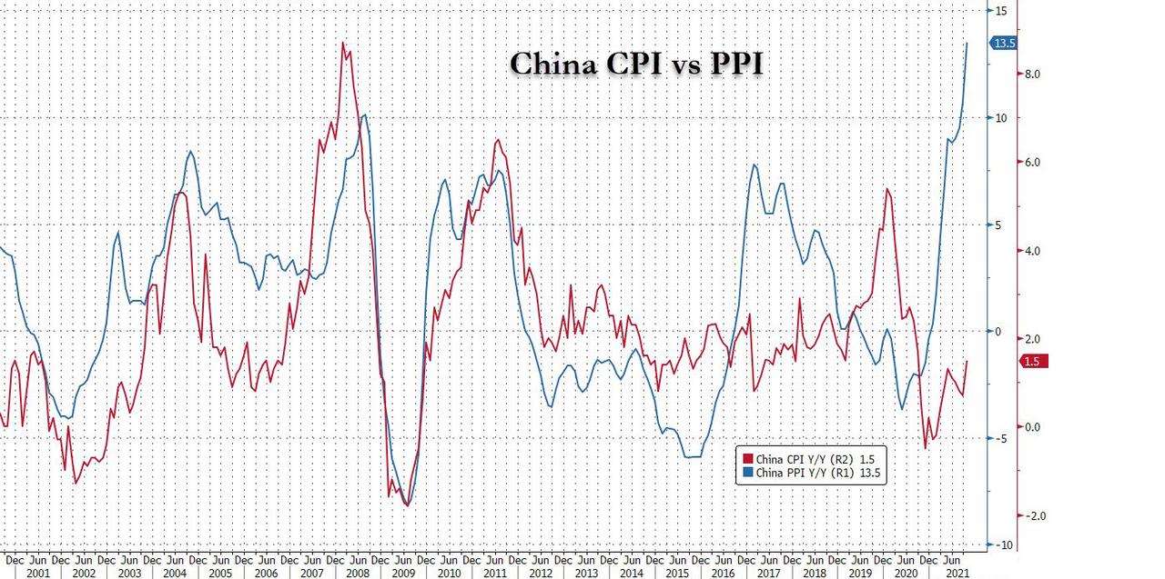 Local stocks were certainly not happy, with China’s CSI 300 Index sliding as much as 1.3% amid signs that producers are passing on higher costs to consumers, and that the PBOC may have no choice but to tighten financial conditions at the expense of risk assets. Several food companies have already announced price hikes of up to 15%, including Haixin Foods, Anjoy Foods and Jiajia Food, due to rising costs for raw materials.