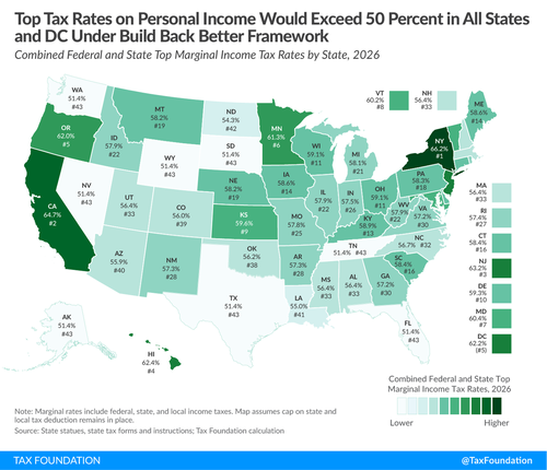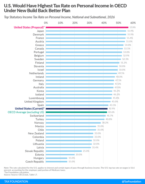 If the Democrats' tax-and-spend reconciliation bill is enacted, the average top tax rate on personal income would rise to 57.4 percent, according to the Tax Foundation.