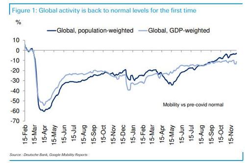 After a day of zigzags on the virus front, we end with some encouraging observations from Deutsche Bank's Jim Reid who shows in his "chart of the day" that according to global mobility data, most of the world is back close to pre-pandemic levels of mobility (at least on a population-weighted basis) even if the GDP-weighted figure still lags, partly due to some of the larger DM economies still being down vs. February 2019.