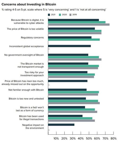As Bitcoin headed for its 434th 'death' this weekend amid a sudden downswing (which has since been bid back up), a survey by Grayscale confirms that investors are embracing Bitcoin and worry less than they did in previous years about the systemic risks, chief among which are cyberattacks, volatility, and regulation.