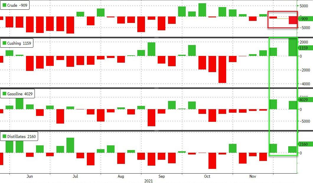 A bigger than expected crude draw last week, according to API, but big builds at Cushing and for products...