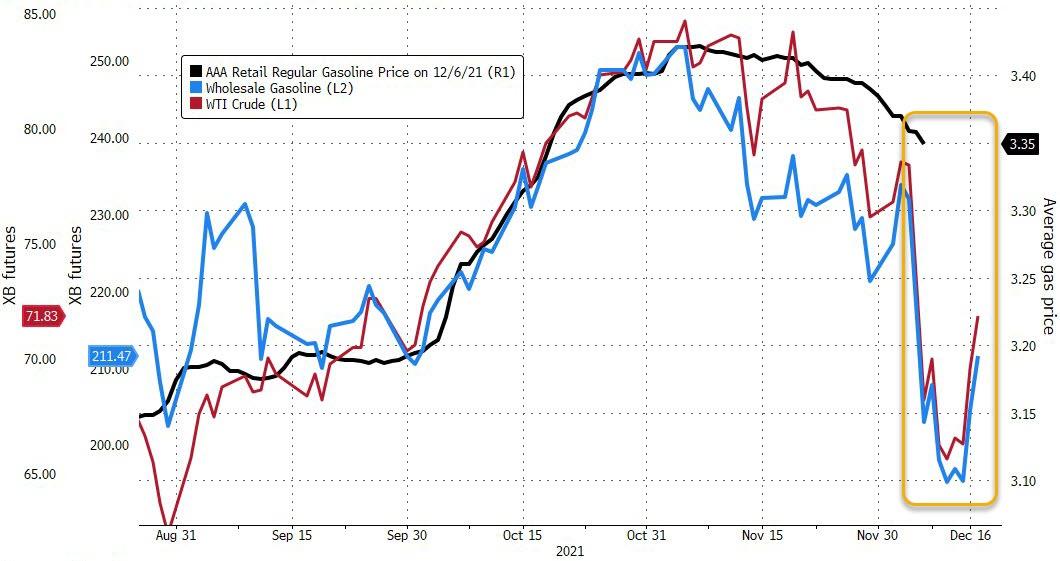 On a side note, while the Biden admin celebrates the 'drop' in the gas price at the pump, the underlying (Crude and Wholesale Gasoline) are starting to rally again as Omicron fears - which sent prices lower - fade...