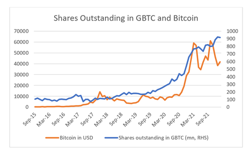However, from a positioning point of view bitcoin looks more troubled. When I look at the largest Bitcoin “ETF” - the Grayscale Bitcoin Trust (GBTC) - shares outstanding have continued to rise in 2021 and 2022 even as Bitcoin performance has been lacklustre.